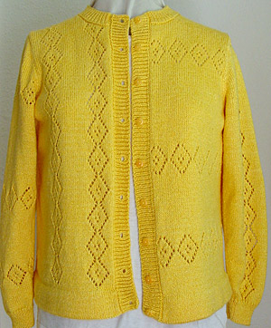 Eine sommerliche Jacke aus Viskose-Baumwoll-Mischgarn, bei der das Lochmuster längs und quer läuft. Ich musste etwas suchen, bis ich ein Muster fand, das sich für beide Richtungen eignete. Bei den waagerechten Streifen kam der Lochschlitten zum Einsatz, die senkrechten habe ich von Hand umgehängt, denn das Muster ist nicht kompliziert.