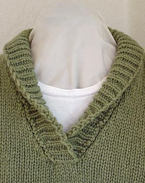 Dieser V-Ausschnitt hat in der vorderen Mitte eine gerade abgekettete Kante, an die die Schmalseiten der Blende angenäht werden. Die Blende ist in einem Stück quer gestrickt. Die 110 Nadeln des Doppelbetts reichten dafür gerade aus. Man kann so eine Blende nicht wie beim Handstricken direkt aus der Kante herausstricken. Sie wird von der Außenkante her angefangen. Ist sie vollendet, dann hängt man alle Maschen aufs HNB um, hängt die Ausschnittkante abschnittsweise dazu und kettet jeweils einen Teil gemeinsam ab, bevor der nächste Teil des Ausschnitts eingehängt wird. |
