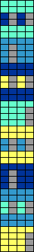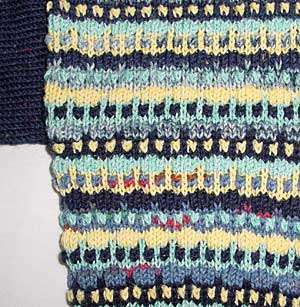 Auf Armlochhöhe wurde die Arbeit in drei Teile geteilt (Rücken, linkes und rechts Vorderteil), und jedes Teil getrennt hochgestrickt. Schultern und Halsausschnitt habe ich nicht abgekettet, sondern mehrere Reihen Kontrastgarn drübergestrickt und dann alles abgeworfen. Normalerweise schließt man erst die Schulternähte und strickt dann die Ärmel nach unten an. Weil aber das Leibteil in einem Stück gestrickt, also schon unter dem Arm geschlossen war, ging das so nicht. Ich ließ die Schultern daher offen und hängte die Armlochkanten so in die Maschine, daß nicht die Schulter, sondern der Achselpunkt in der Mitte des Nadelbetts lag. Dann strickte ich den Ärmel an, und zwar glatt rechts, damit das Ganze nicht zu bunt wurde. Dabei nahm ich ganz normal beidseitig ab. Diese Abnahmen und die Ärmelnaht kamen nun oben auf dem Arm zu liegen. Das ergibt übrigens eine ziemlich gute Passform. Um meine verschiedenen marineblauen Reste nicht direkt aneinanderstoßen zu lassen, strickte ich Blockstreifen in Türkis und Gelb mit ein. Auch die Bündchen und Blenden sind jeweils aus verschiedenen Resten, das fällt gar nicht auf. Mit leuchtend türkisfarbenen Knöpfen wurde die Jacke dann vervollständigt. Insgesamt wiegt sie ungefähr 130 Gramm, die Hälfte davon marineblau, von den anderen drei Faben verbrauchte ich jeweils knapp 25 g. Auf diese Weise könnt bestimmt auch Ihr einiges von Euren Sockengarnresten verarbeiten. Wenn Ihr für ein größeres Kind oder einen Erwachsenen strickt, benötigt Ihr natürlich mehr Material. Und wenn's für eine Jacke nicht reicht: Das Muster eignet sich auch gut für einen Pullunder. |