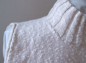 Nach diesem Schnitt hatte ich im Mai schon einen Pulli in Rot gestrickt. Der gefiel mir so gut, dass ich noch einen weiteren in dieser Art haben wollte. Diesmal nahm ich ganz dünnes naturfarbenes Garn mit Flammé-Struktur, das gar kein Muster mehr benötigt. Nur glatt rechts gestrickt hätten sich aber die Armlochkanten nach innen gerollt. Damit das nicht passierte, bekamen sie eine kleine Rollblende, siehe Bild unten. |