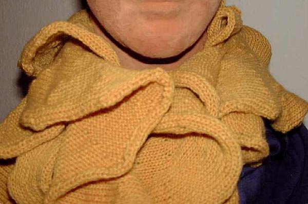 Korkenzieher-Schal auf der Strickmaschine© 2005 Michaela Renz. Die Weitergabe dieser Anleitung ist erlaubt, sofern dieser Copyright-Hinweis dabei ist. Die Verwendung dieser Anleitung für kommerzielle Zwecke ist nicht zulässig. Wer noch Anregungen für ein Weihnachtsgeschenk braucht: mit einem Korkenzieherschal löst man zumindest einen Überraschungseffekt aus. Der Schal ist auch für Anfänger leicht anzufertigen und eine Einbettmaschine reicht aus. Allerdings sollte man mindestens vier bis fünf Stunden Strickzeit kalkulieren. Diese beiden Vorschläge wurden mit dem Brother Feinstricker KH 830 mit Lochkartenautomatik gestrickt. Der petrolfarbene Schal hat ein Fangpatentmuster, er lässt sich enger rollen. Beim gelben wurden mehr Maschen angeschlagen und glatt gestrickt, er schmiegt sich üppiger um den Hals. Durch den sich einrollenden Außenrand ist die Korkenzieherdrehung nicht so stabil.