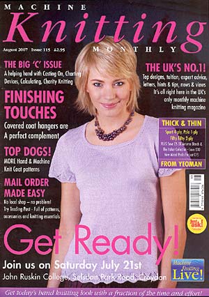 Die Vorlage für diesen Pulli fand ich auf der Titelseite der Ausgabe 08/2007 von "Machine Knitting Monthly". Dort war er aus viel dünnerem Garn in Flieder abgebildet, siehe unteres Bild. Für so feines Gestrick in meiner Größe hätten aber die 200 Nadeln der Strickmaschine kaum ausgereicht. Klar, dass ich dickeres Garn und eine größere MW nehmen musste, und den Schnitt passte ich auch gleich meinen Maßen an. Als nächstes änderte ich die Anschlagkante. Im Original wurde ein doppelter Häkelanschlag gemacht, aber beim Versuch, die zweite Anschlagkante zu häkeln, brach ich mir fast die Finger. Deshalb entschied ich mich für drei Krausreihen nach dem einfachen Häkelanschlag. Darüber kam dann das originale Lochmuster über acht Reihen, allerdings von Hand umgehängt. Meine Version unterscheidet sich vom Original noch in weiteren Punkten: Erstens verlegte ich die Ab- und Zunahmen des Vorderteils von der Seitennaht weg nach innen, unterhalb des Brustpunktes. So entstand eine schöne, abnäherähnliche Linie. |
