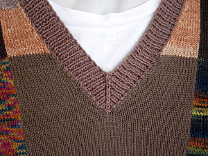 Zuerst sollte der Pulli ja ein Pullunder werden, deshalb strickte ich einen V-Ausschnitt. Die Blende ist nach der Anleitung Nr. 53 aus dem Kragen-Buch mit dem KG-Schlitten gestrickt. Ich finde, diese Variante sieht immer besonders schön und sauber aus. |